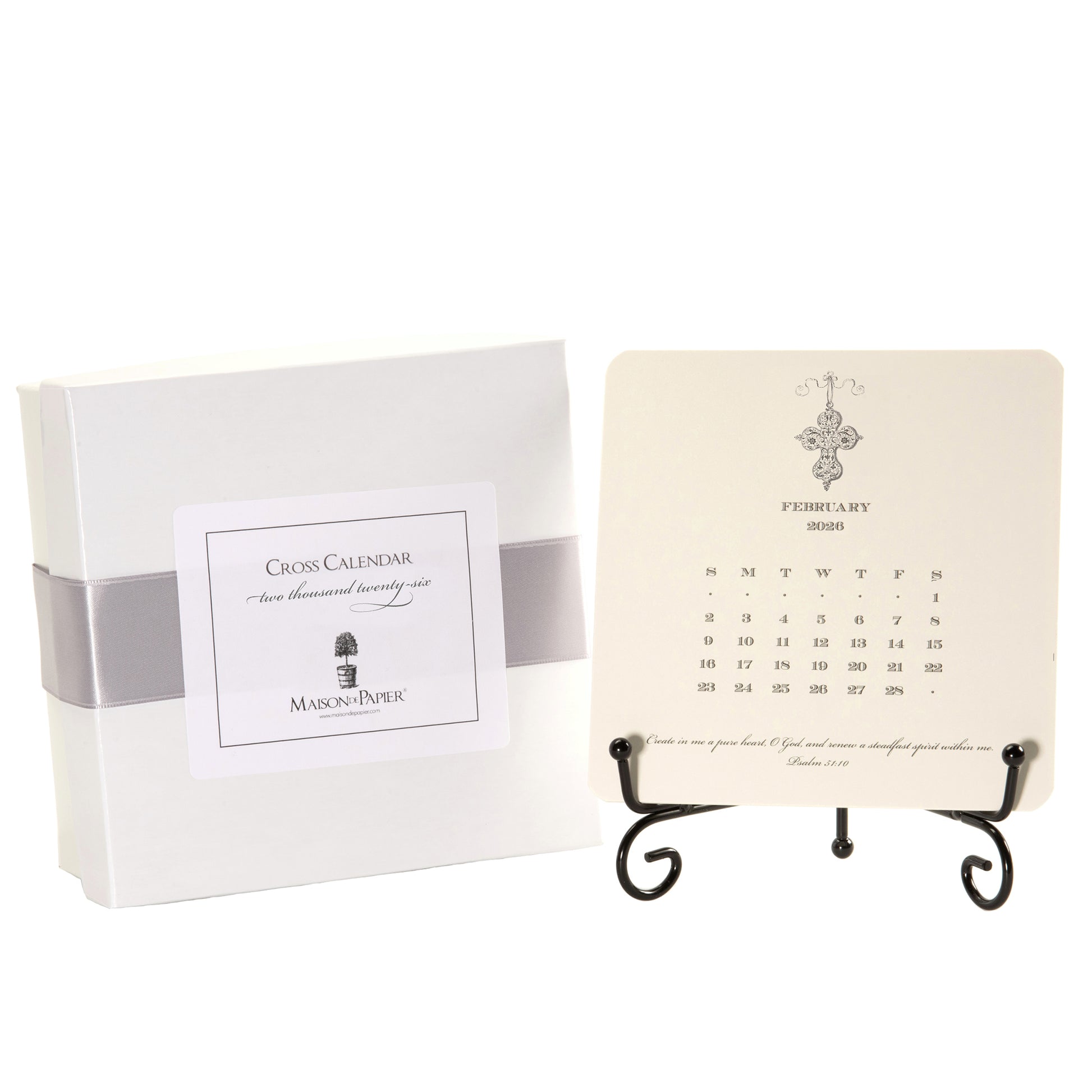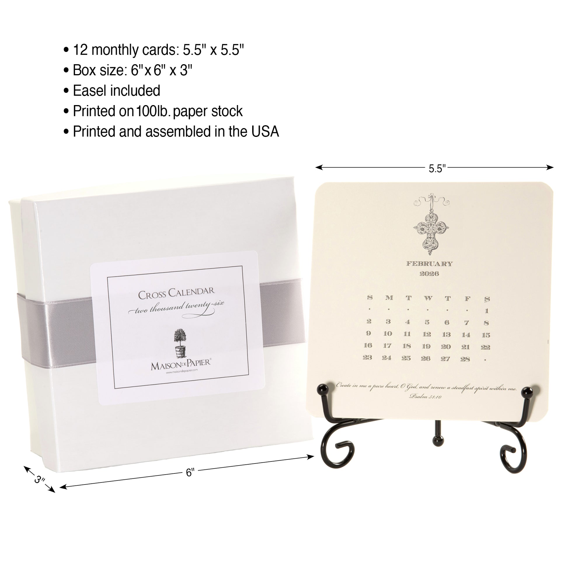Our Cross Calendar features 12 beautifully designed 5 ½ inch square cards, each printed on high-quality 100lb cardstock. Every month showcases a unique cross illustration accompanied by a powerful Bible verse, providing daily inspiration and guidance. The set includes a metal easel, perfect for displaying each card with grace and reverence. Presented in a beautifully boxed package and sealed with a double-faced satin ribbon, this calendar makes a meaningful and luxurious gift.