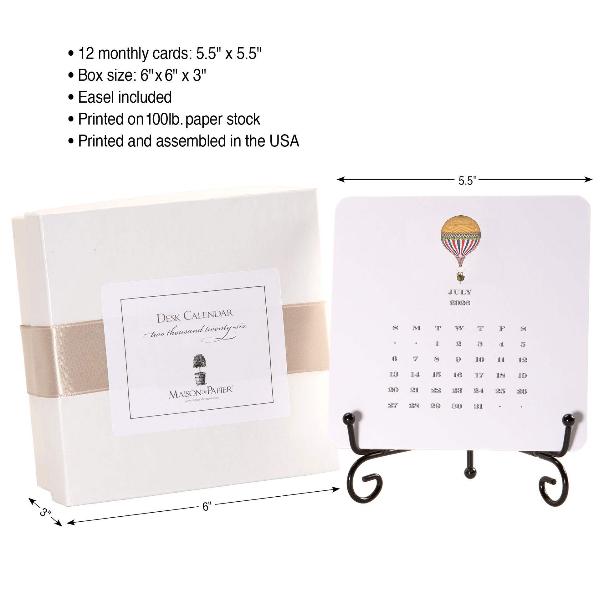 Our Desk Calendar features 12 beautifully crafted 5 ½ inch square cards, each printed on premium 100lb cardstock. Each card is adorned with a unique design that captures the essence of the seasons and cherished holidays, providing a visual delight every month. The set includes a metal easel, adding sophistication and flair to the display. Presented in an exquisite box and sealed with a double-faced satin ribbon, this calendar is a treasure to unbox and cherish, making it an ideal gift for those with discerning tastes and a love for the finer things in life.
