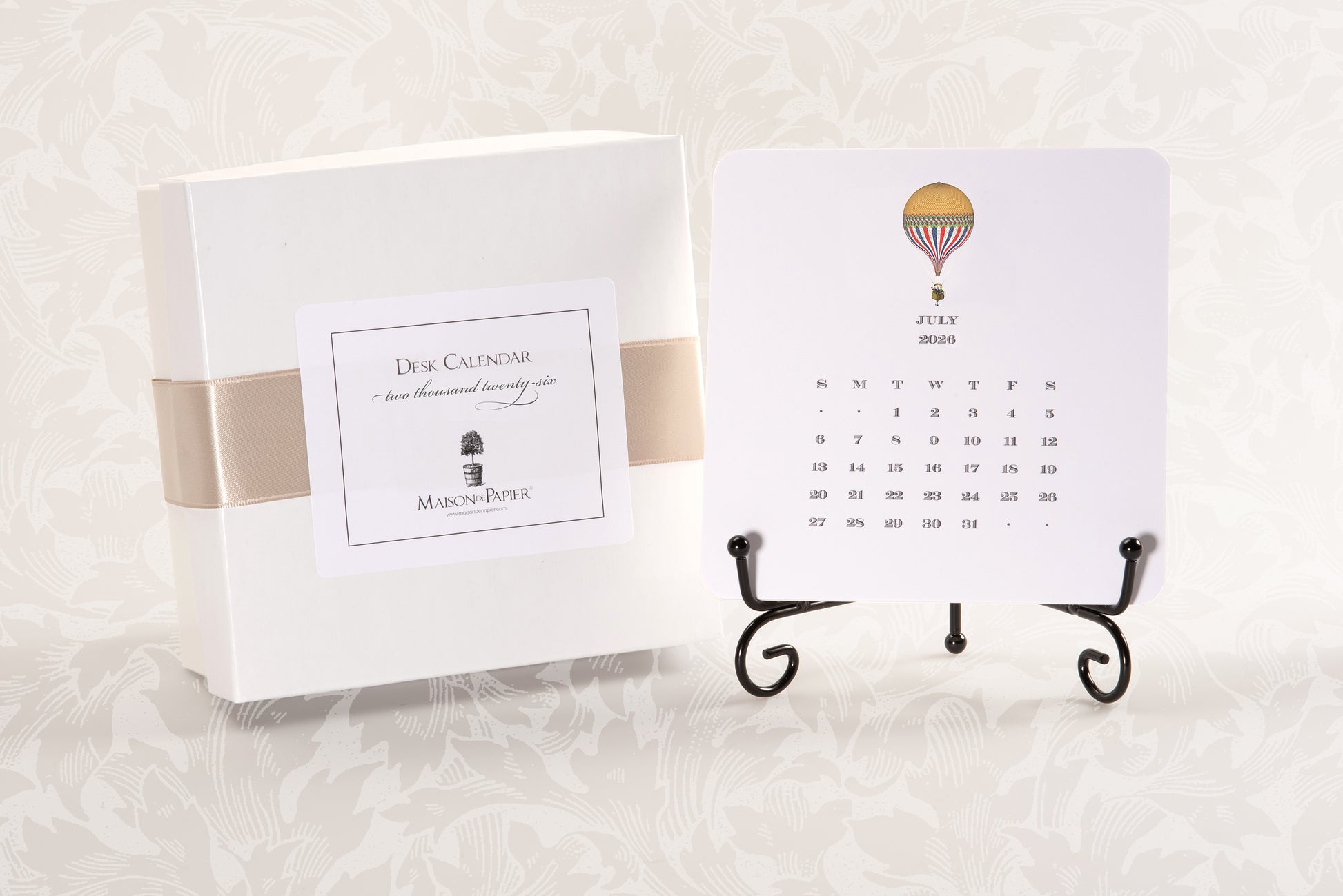 Our Desk Calendar features 12 beautifully crafted 5 ½ inch square cards, each printed on premium 100lb cardstock. Each card is adorned with a unique design that captures the essence of the seasons and cherished holidays, providing a visual delight every month. The set includes a metal easel, adding sophistication and flair to the display. Presented in an exquisite box and sealed with a double-faced satin ribbon, this calendar is a treasure to unbox and cherish, making it an ideal gift for those with discerning tastes and a love for the finer things in life.