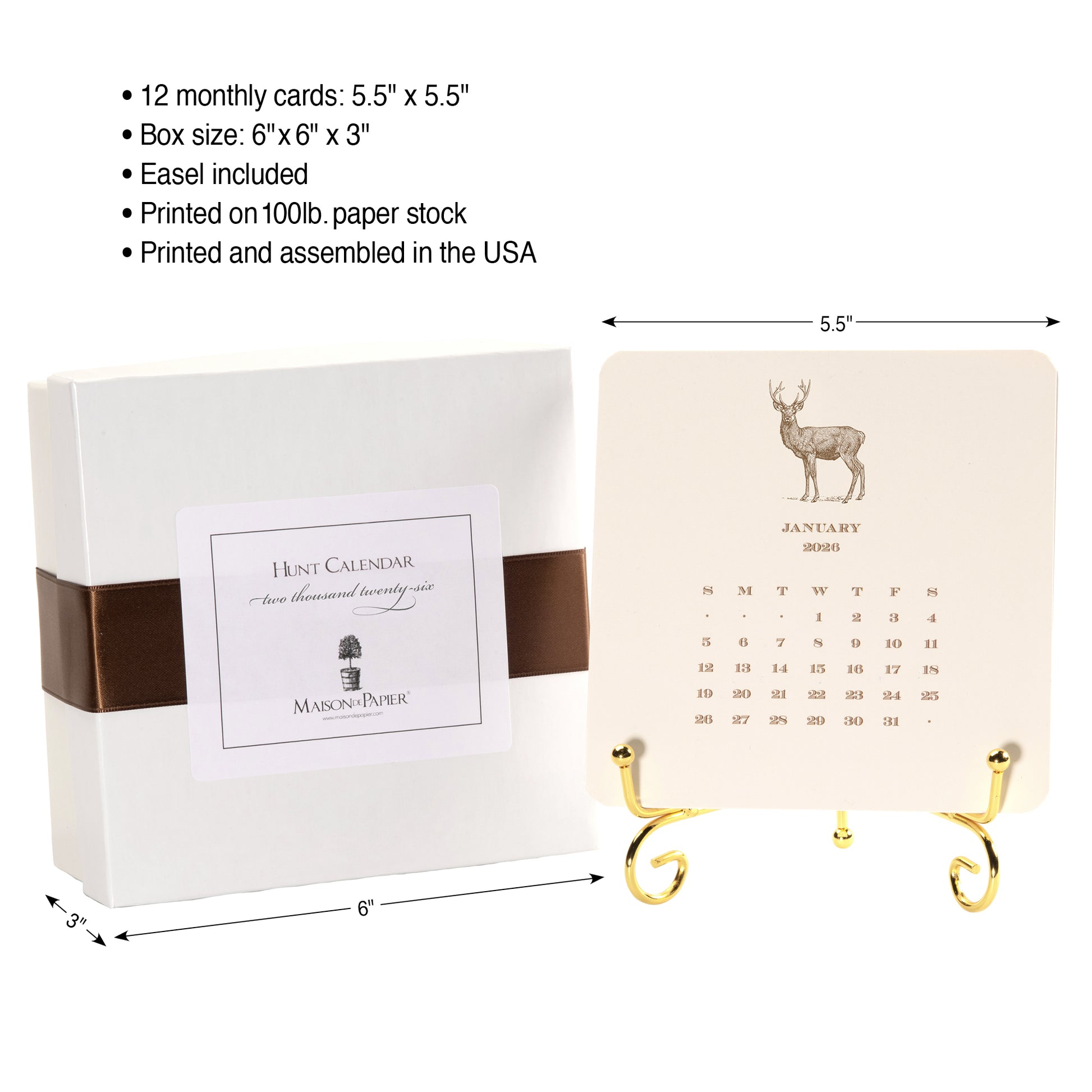 Our Hunt Calendar features 12 meticulously crafted 5 ½ inch square cards, printed on premium 100lb cardstock for durability and a luxurious feel. Each card showcases a unique illustration, immersing you in the beauty of nature and the excitement of the hunt. The set includes a metal easel, providing a sturdy and elegant display stand. Presented in a thoughtfully designed box and sealed with a double-faced satin ribbon, this calendar exudes luxury and thoughtfulness, making it the perfect gift for those who have a passion for hunting and fishing and appreciate the finer things in life.