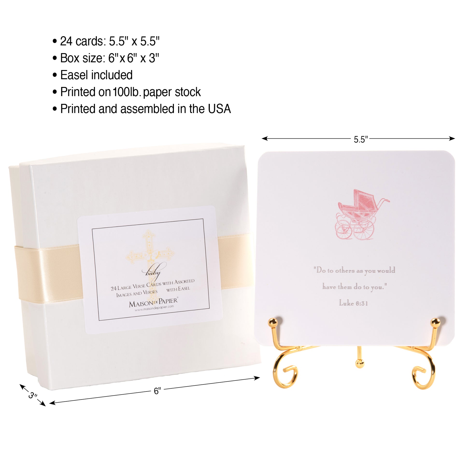 Introducing the Baby Oversized Quote Cards with Easel, a luxurious gift designed to fill a baby's nursery with love, inspiration, and the gentle teachings of faith. This exquisite boxed set features 24, 5 ½ inch square cards adorned with youthful, sweet motif designs and carefully selected Bible verses.