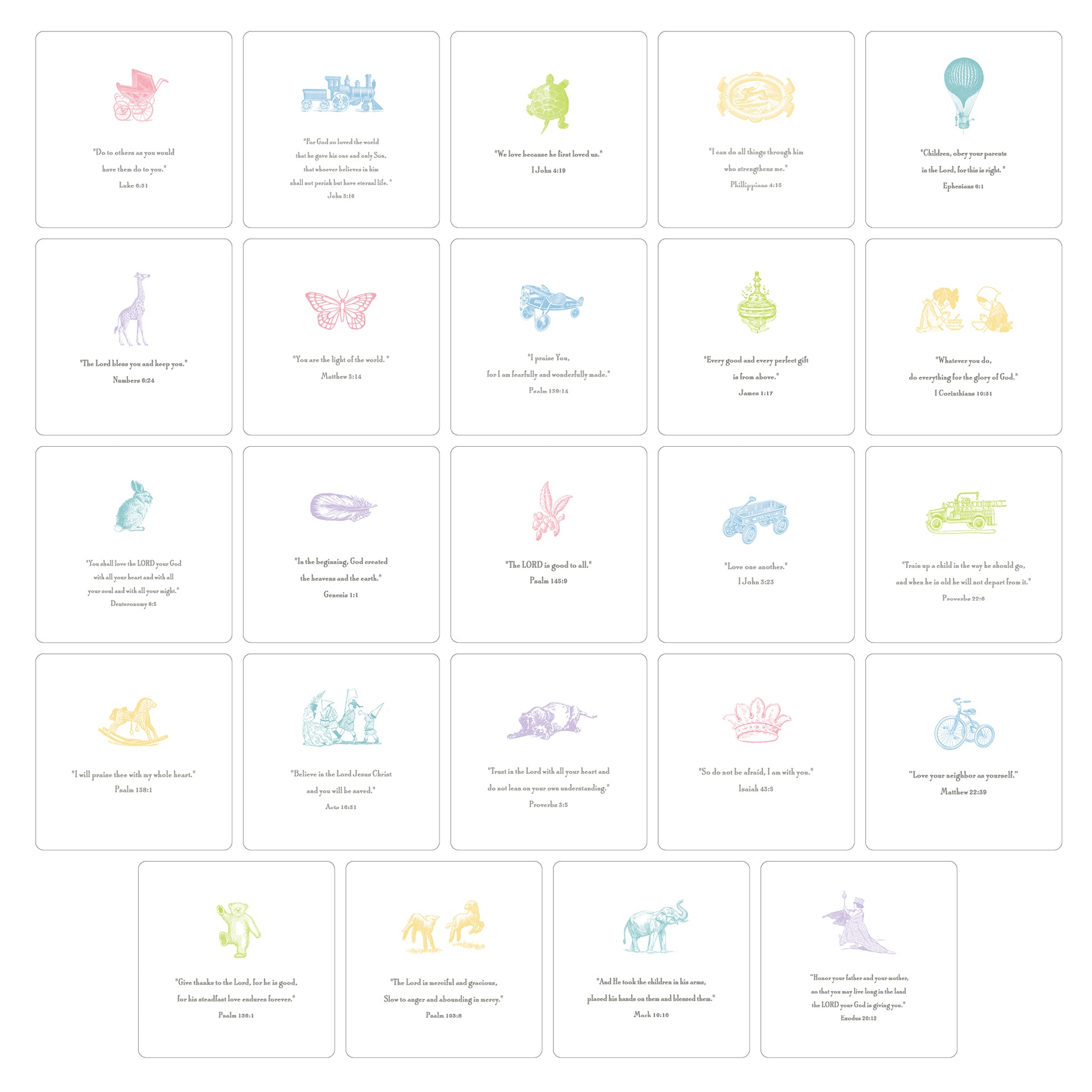 Printed on premium 100lb cardstock, each card is a testament to quality and attention to detail, ensuring a luxurious feel and long-lasting beauty. These inspirational cards bring a touch of innocence and joy to the nursery, nurturing a sense of faith and wonder in your little one's life.