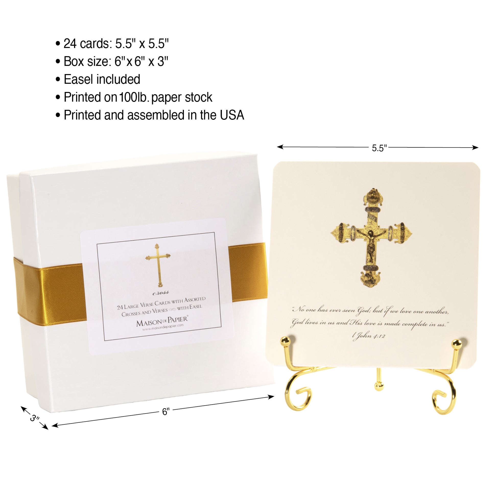 Introducing the Cross Oversized Quote Cards with Easel, a luxurious gift that combines timeless elegance with the power of inspirational Bible verses. This exquisite boxed set features 24, 5 ½ inch square cards adorned with classical cross motifs, meticulously designed to inspire and uplift the spirit.
