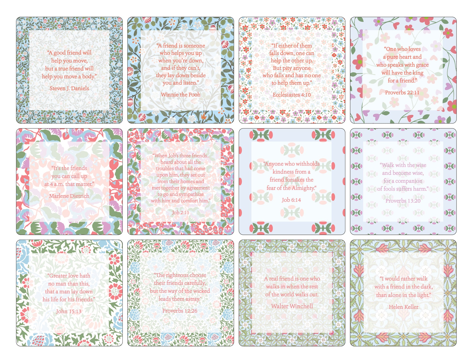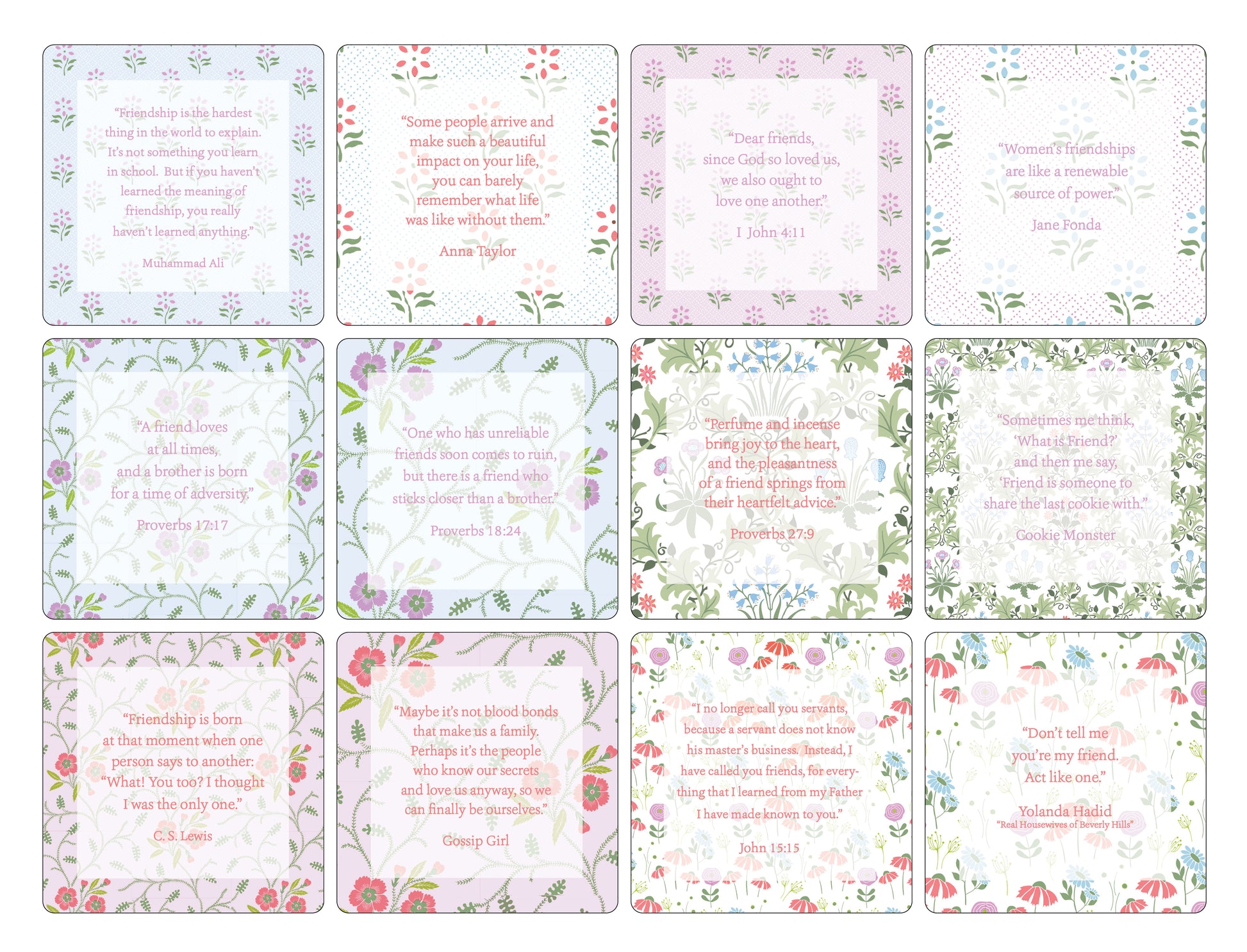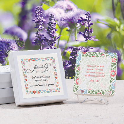 24 Verse Cards (3" x 3") with one acrylic easel. Each card is printed with a different floral background and verse on friendship. Cards are boxed with a foldable acrylic easel.
