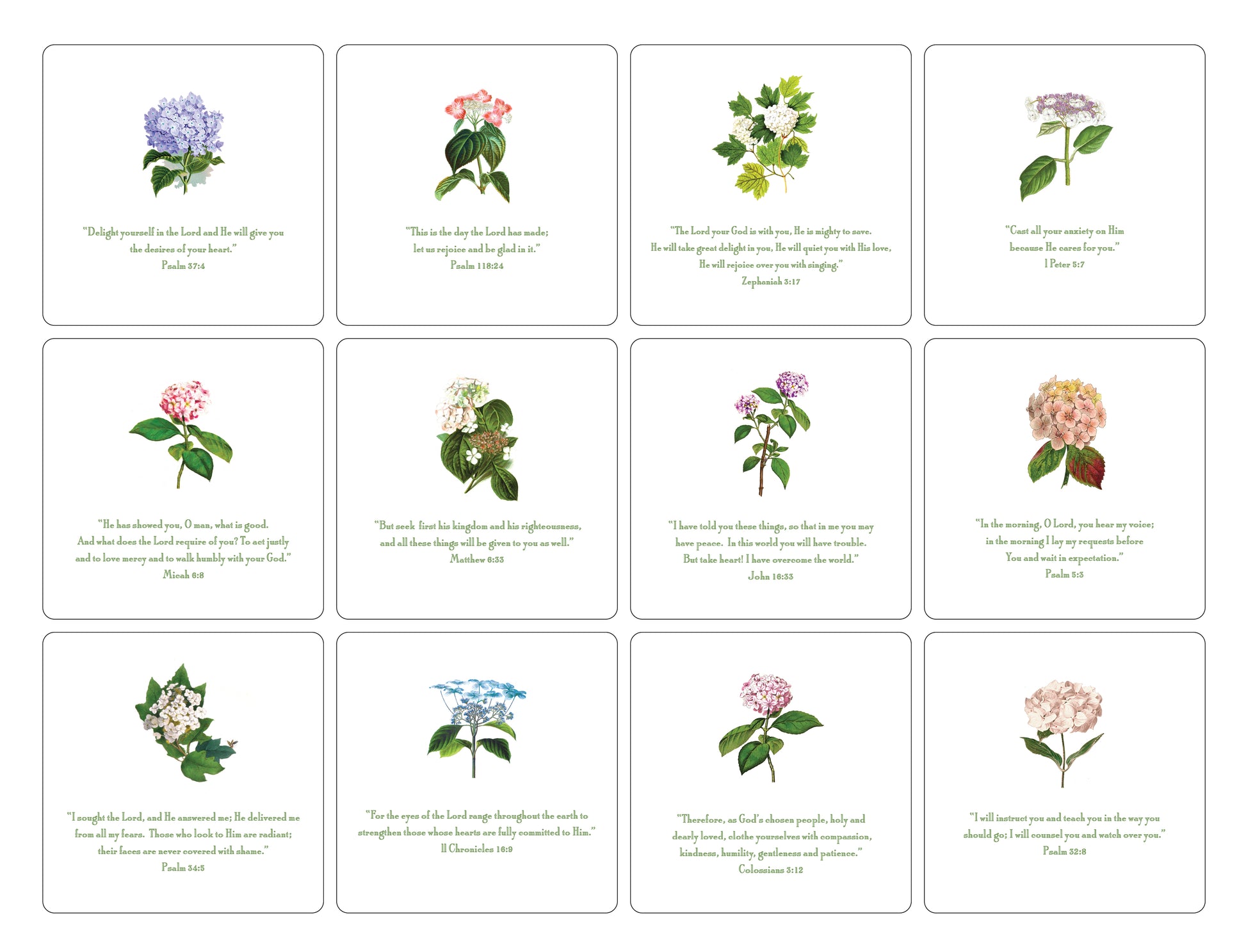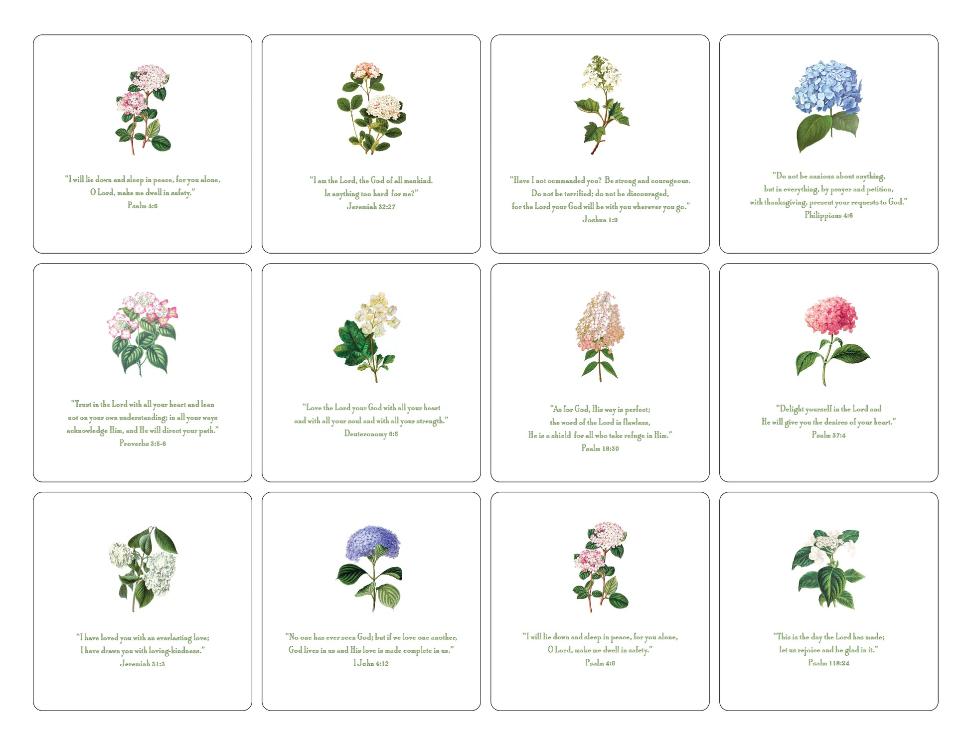 Introducing the Hydrangea Oversized Verse Cards with Easel, a remarkable luxury gift that combines the power of inspirational verses with timeless beauty. This exquisite boxed set features 24, 5 ½ inch square cards printed on premium 100lb cardstock, each adorned with a different uplifting Bible verse and a captivating floral design.