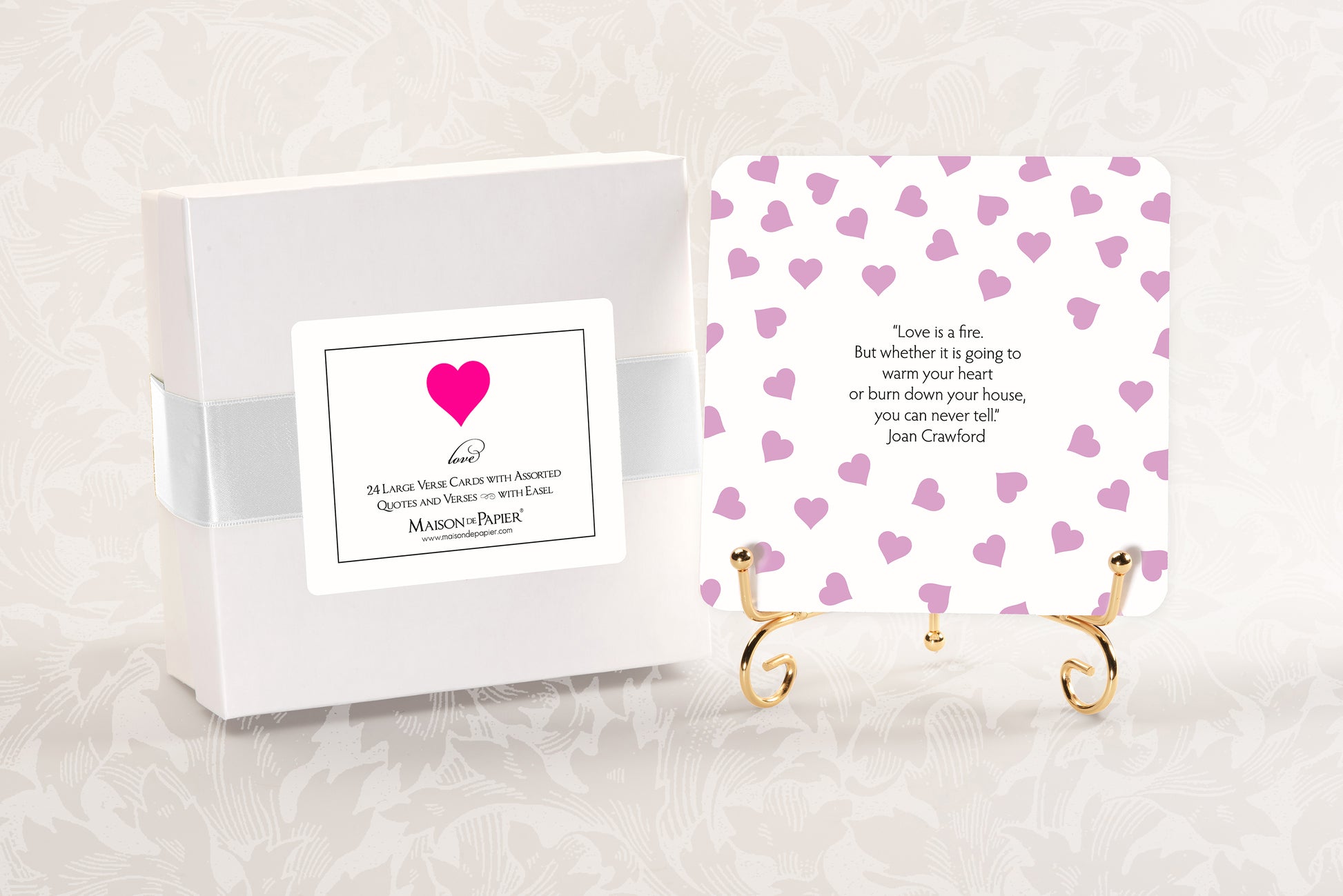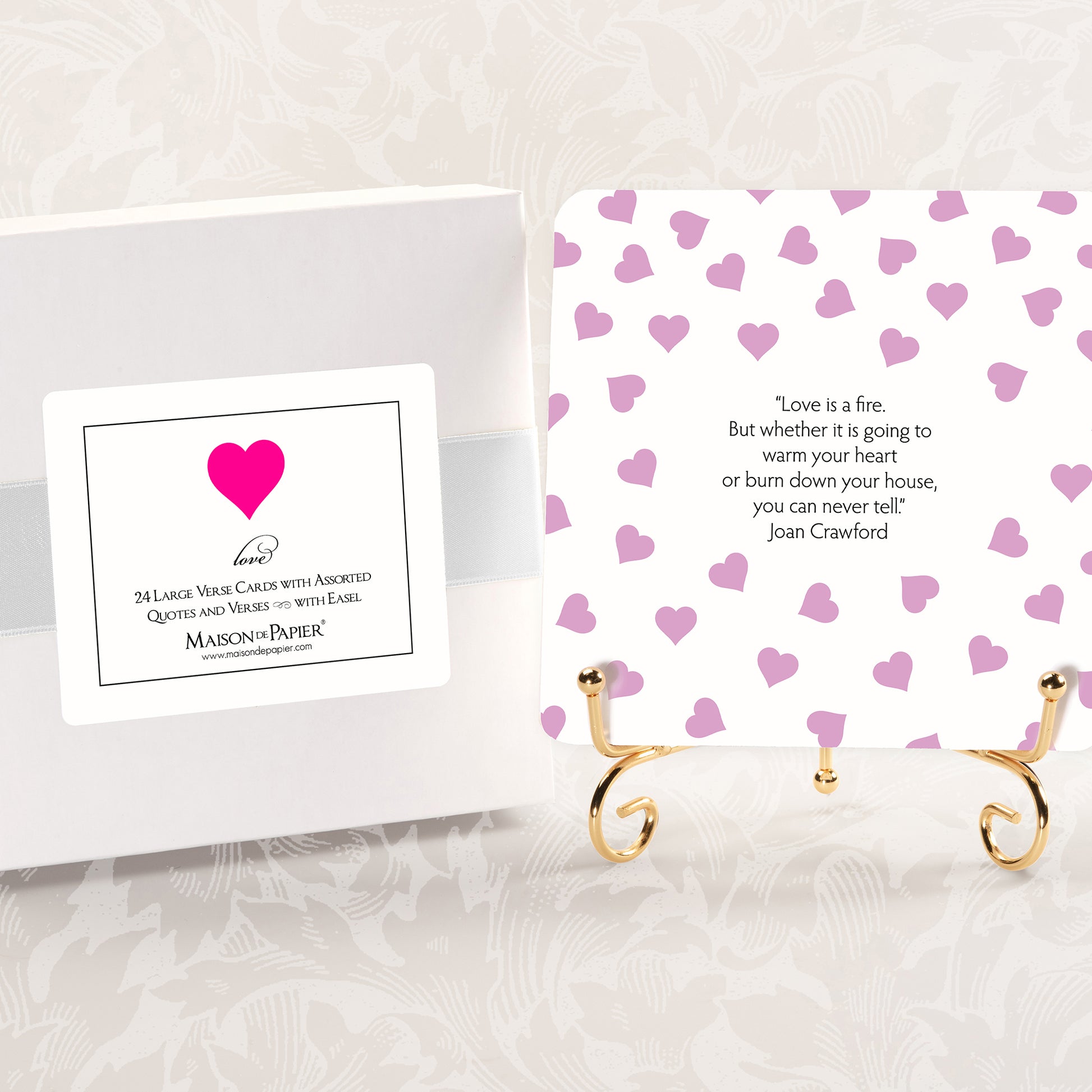 Introducing the Love Oversized Verse Cards with Easel, a remarkable luxury gift that combines the power of quotes with timeless beauty. This exquisite boxed set features 24, 5 ½ inch square cards printed on premium 100lb cardstock, each adorned with a different Love themed quote with hearts.